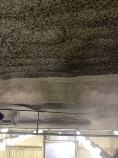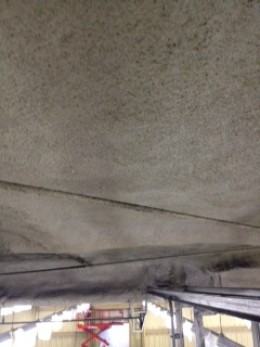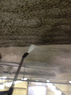 天井の作業前 → 高圧温水ジェットによる汚れ除去