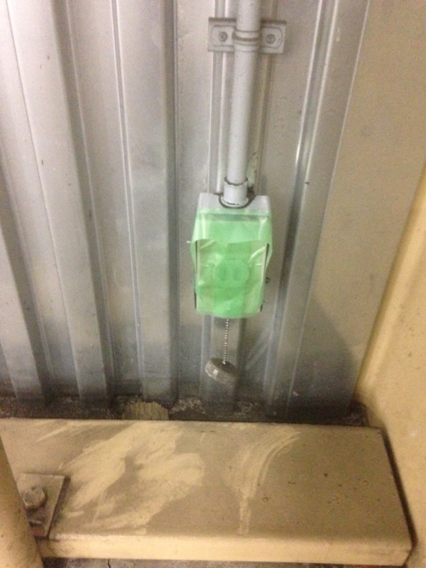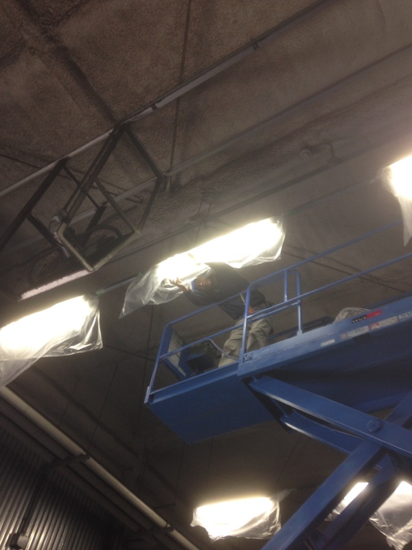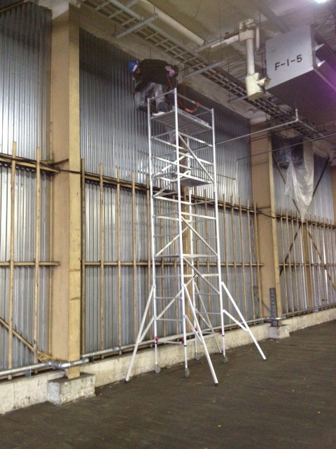 まずは電気系統の各所に防水のための養生を施す。高いところはテーブルリフターやローリングタワーを組みます。